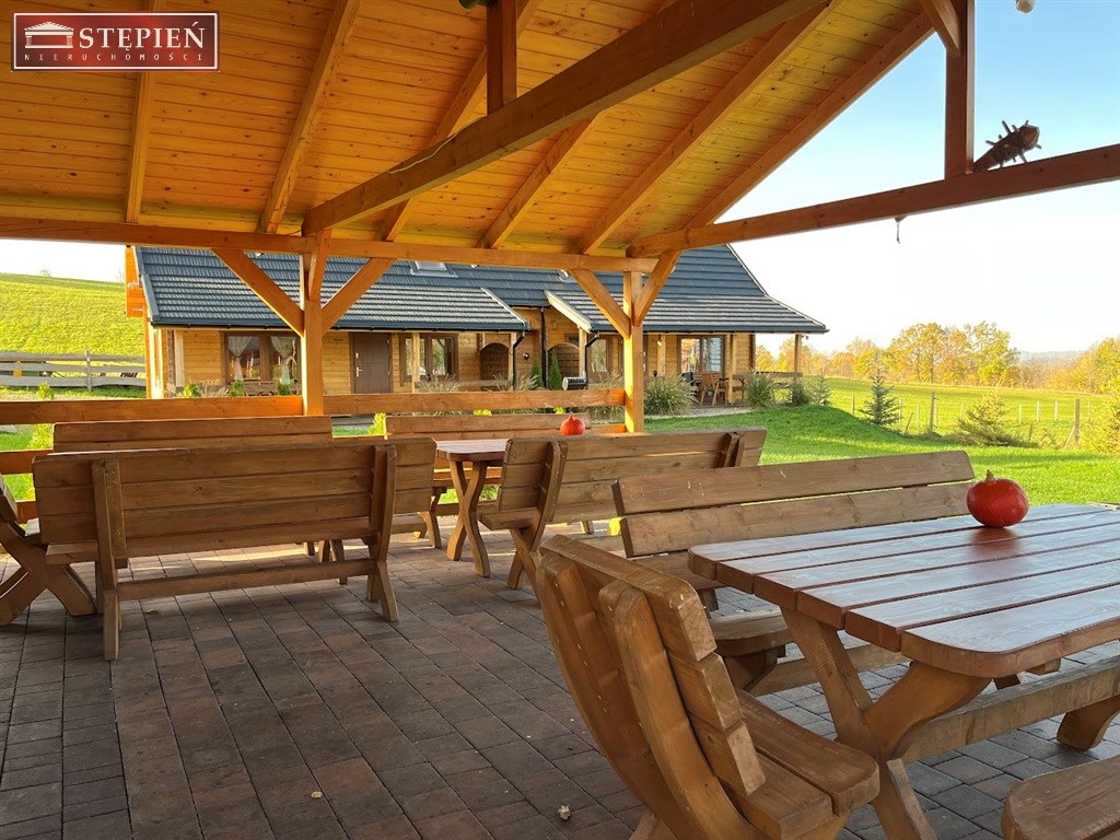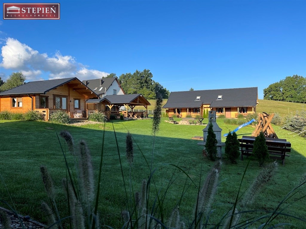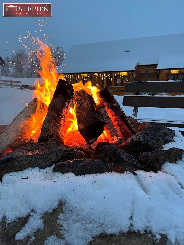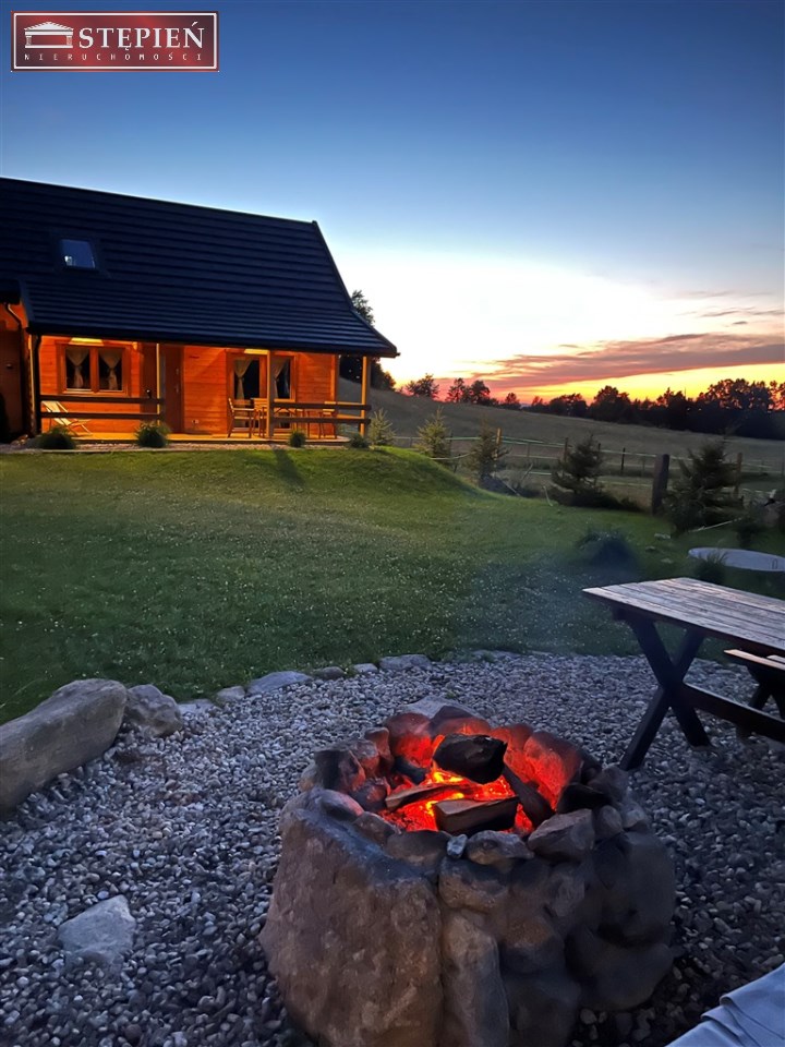 Teren posesji został zaaranżowany z myślą o wypoczynku i relaksie gości. Znajduje się tu miejsce na grilla pod zadaszoną wiatą oraz wydzielony krąg ogniskowy, idealny do spędzania letnich wieczorów w otoczeniu natury. Całość położona jest w cichej, malowniczej okolicy, z pięknymi widokami na pobliskie góry, co tworzy idealne warunki do wypoczynku z dala od miejskiego zgiełku.
