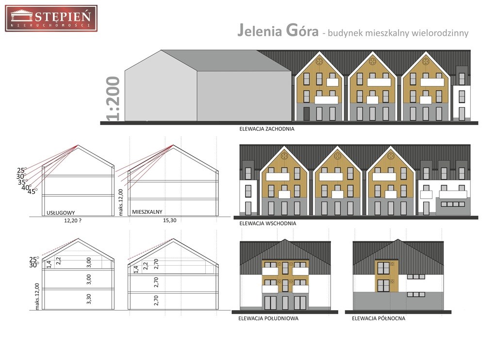 a) maksymalna wysokość budynków usługowych nie powinna przekroczyć 12m od najniższego poziomu terenu do kalenicy dachu a budynków towarzyszących ( pomocniczych ) 2/3 wysokości budynków głównych,