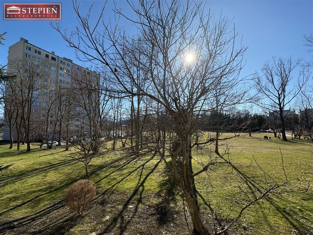 Z balkonu rozpościera się piękny widok na teren zielony.