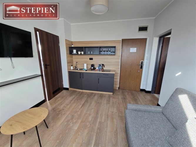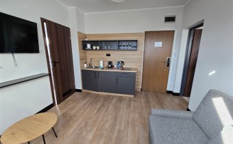Salon z aneksem kuchennym – apartament jest jednym z nielicznych w tym obiekcie, który posiada aneks kuchenny, co daje możliwość samodzielnego przygotowywania posiłków.