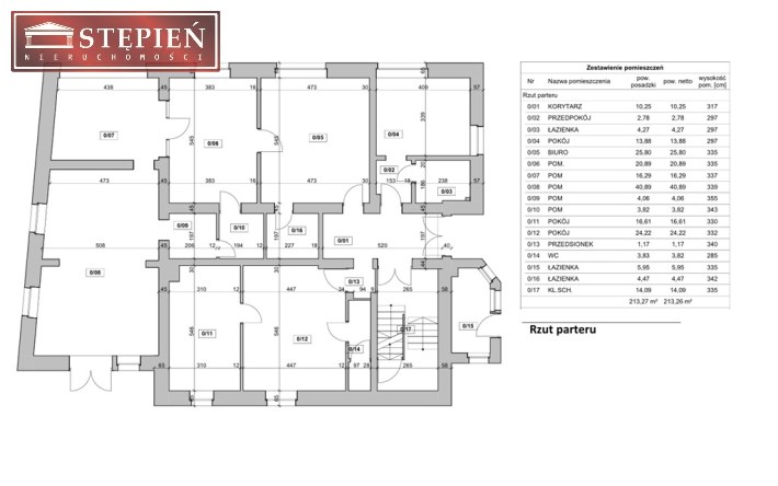 Piętro – 213 m² (gotowe do użytkowania, w bardzo dobrym stanie technicznym, obecnie wykorzystywane w celach biurowych)
